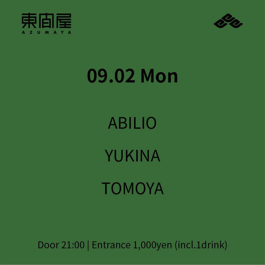 2019.09 02 SEP Azumaya -Monday- HOUSE TECHNO 0 Shares Facebook Twitter google Line DATE: 2019-09-02 MON OPEN: 21:00 VENUE: PRICE: Entrance 1,000yen(incl. 1drink) LINE UP: ABILIO YUKINA TOMOYA
