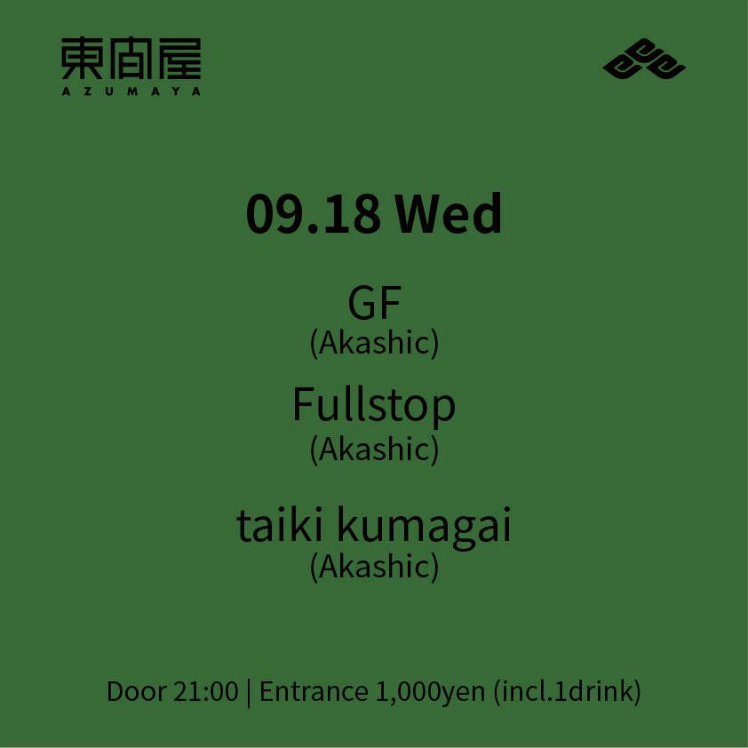 2019.09 18 SEP Azumaya -Wednesday- TECHNO 0 Shares Facebook Twitter google Line DATE: 2019-09-18 WED OPEN: 21:00 VENUE: PRICE: Entrance 1,000yen(incl. 1drink) LINE UP: GF(Akashic) Fullstop(Akashic) taiki kumagai(Akashic)