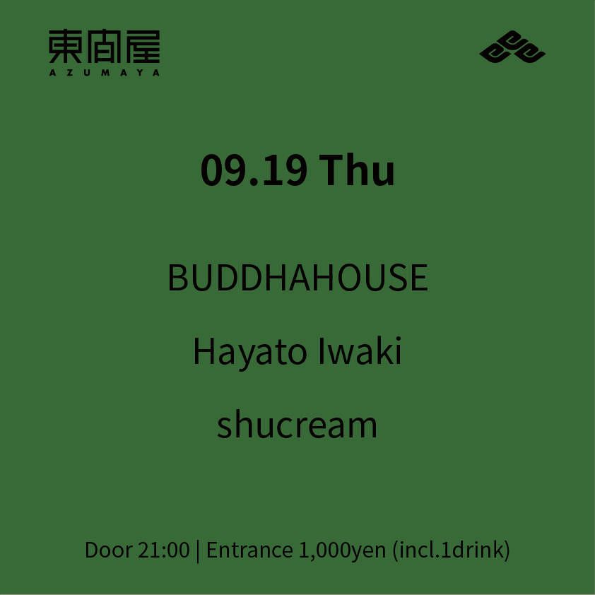 2019.09 19 SEP Azumaya -Thursday- HOUSE 0 Shares Facebook Twitter google Line DATE: 2019-09-19 THU OPEN: 21:00 VENUE: PRICE: Entrance 1,000yen(incl. 1drink) LINE UP: BUDDHAHOUSE Hayato Iwaki shucream