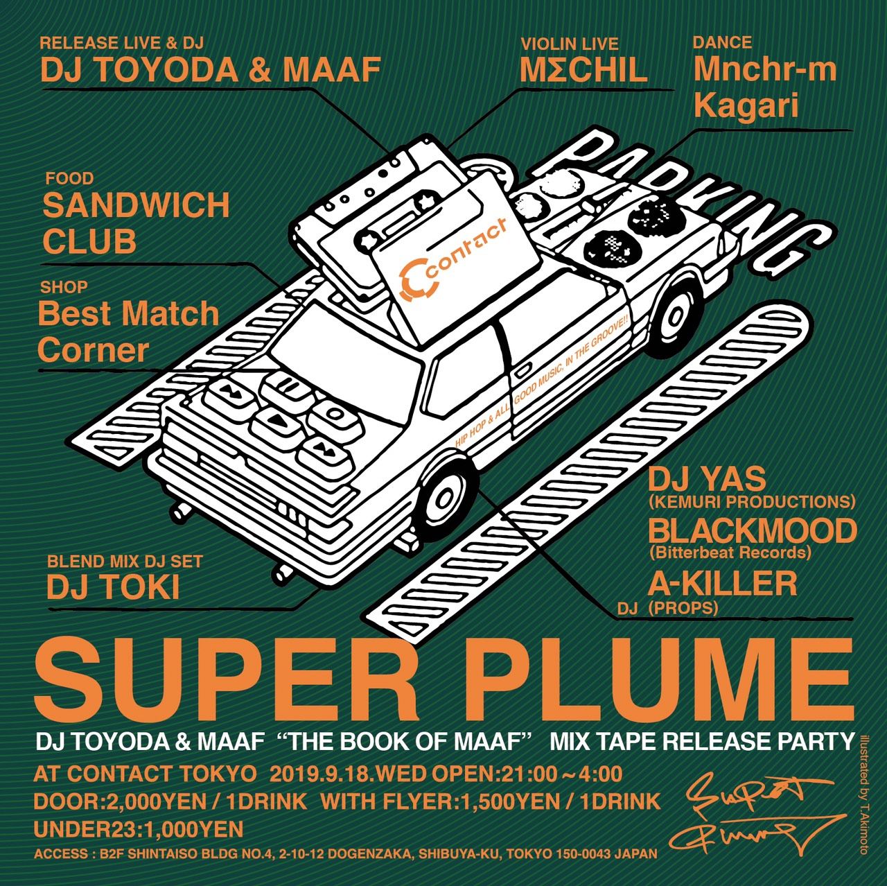 ブラックミュージックをメインにクロスオーバーなスタイルを提案。ヒップホップを基軸にしながらも様々なバックグラウンドを持つアーティストがその枠組みに囚われないアートフォームを披露する。今回は、Super PlumeレギュラーDJ ToyodaとラッパーMAAFの共作ミックステープ「THE BOOK OF MAAF」の発売記念としてスペシャル・リリースライヴを敢行。そして、今回もDJ Yasを筆頭に、BLACKMOOD、A-KILLER、Tokiといった手練れが集い、Mnchr-mとKagariによるダンス、そしてMΣCHILがヴァイオリンライヴを披露するなど様々な現場で活躍するアーティストが渋谷最奥のヒップホップ空間を燃やす。