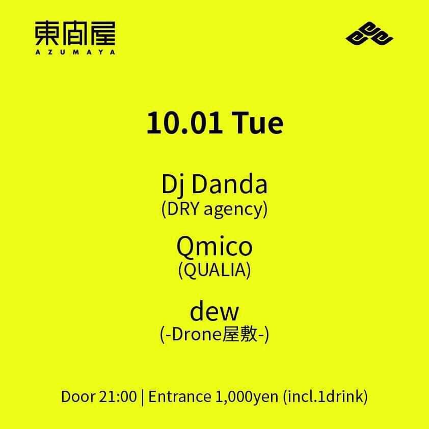 2019.10 01 OCT Azumaya -Tuesday- TECHNO 0 Shares Facebook Twitter google Line DATE: 2019-10-01 TUE OPEN: 21:00 VENUE: PRICE: Entrance 1,000yen(incl. 1drink) LINE UP: Dj Danda(DRY agency) Qmico(QUALIA) dew(-Drone屋敷-)