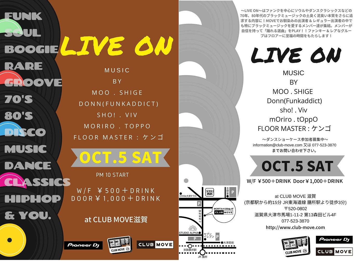 ~LIVE ON~はファンクを中心にソウルやダンスクラシックスなどの70年、80年代のブラックミュージックの土臭く泥臭い本質をさらに追求する内容に!MOVEでお馴染みの出演者 & レギュラー出演者の中でも特にブラックミュージックを愛するメンバー達が集結。メンバーが自信を持って「踊れる選曲」をPLAY!!ファンキー & レアなグルーブはフロアーに至福の時間をもたらします!