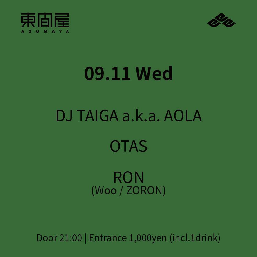 2019.09 11 SEP Azumaya -Wednesday- HOUSE 0 Shares Facebook Twitter google Line DATE: 2019-09-11 WED OPEN: 21:00 VENUE: PRICE: Entrance 1,000yen(incl. 1drink) LINE UP: DJ TAIGA a.k.a. AOLA OTAS RON(Woo / ZORON)