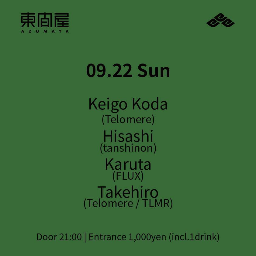 2019.09 22 SEP Azumaya -Sunday- HOUSE TECHNO 0 Shares Facebook Twitter google Line DATE: 2019-09-22 SUN OPEN: 21:00 VENUE: PRICE: Entrance 1,000yen(incl. 1drink) LINE UP: Keigo Koda(Telomere) Hisashi(tanshinon) Karuta(FLUX) Takehiro(Telomere / TLMR)