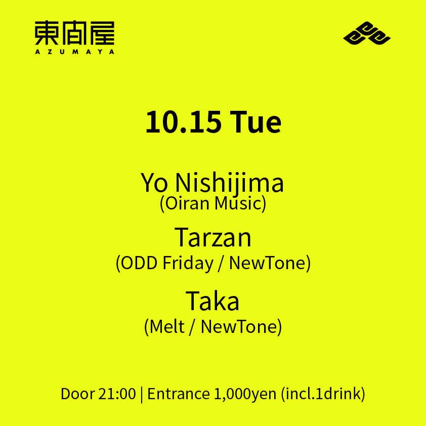 2019.10 15 OCT Azumaya -Tuesday- HOUSE TECHNO 0 Shares Facebook Twitter google Line DATE: 2019-10-15 TUE OPEN: 21:00 VENUE: PRICE: Entrance 1,000yen(incl. 1drink) LINE UP: Yo Nishijima(Oiran Music) Tarzan(ODD Friday / NewTone) Taka(Melt / NewTone)
