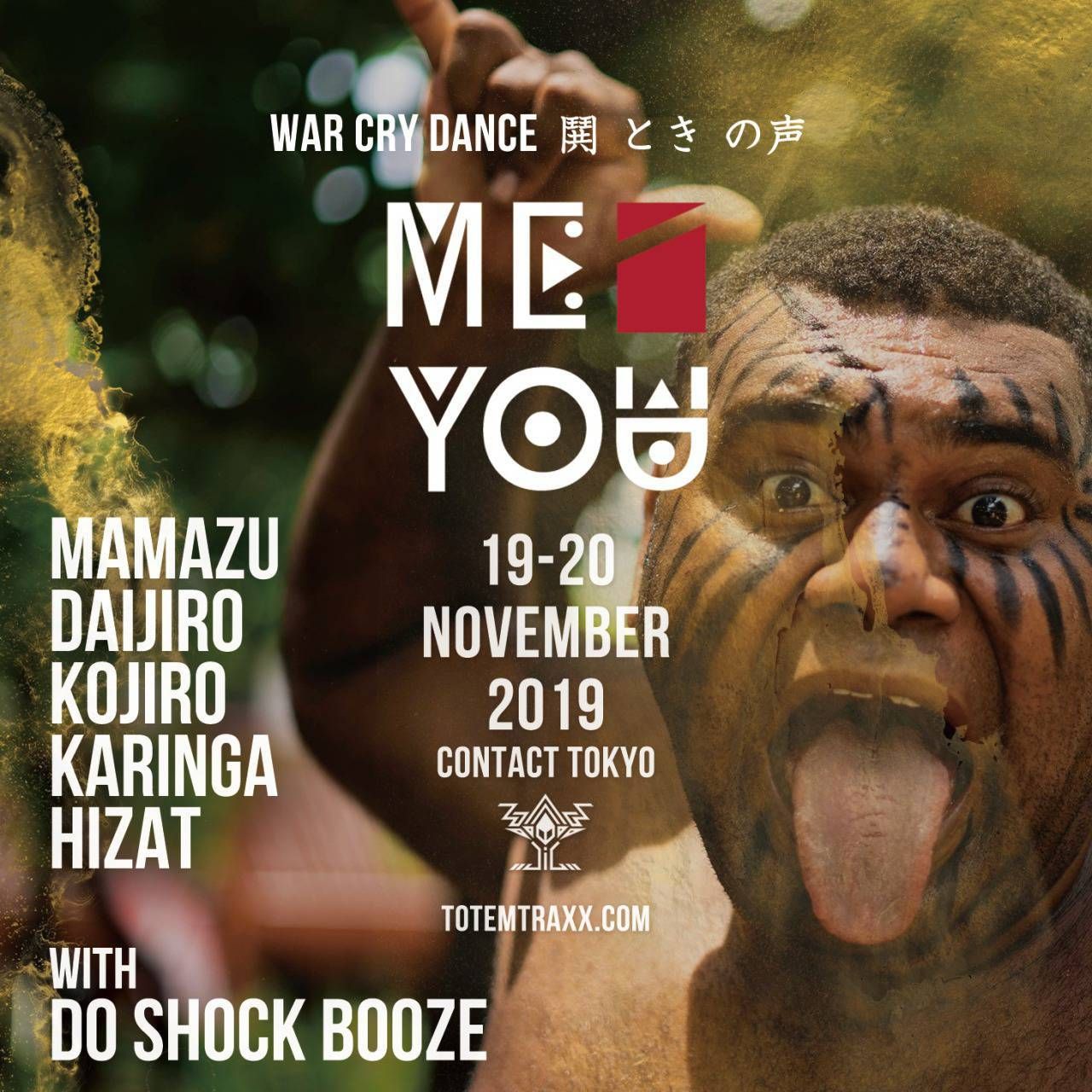 今回のテーマは、“War Cry Dance 鬨 とき の声”。MEiYOU初登場となるMamazuは、レーベル〈Hole and Holland〉主宰、楽曲制作やリリースも積極的に行い、Nicola CruzやAndrew Weatherallとも共鳴し、Fuji Rock FestivalやBoiler Roomにも出演。主催のDo Shock Boozeと同様にJ.A.K.A.M. a.k.a MoochyやZEN RYDAZ等のリミックスも手掛けているヤバい男だ。定期的に出演を重ねているDJ DAISUKI (大好き) Daijiroは、プログレッシブサウンドを基本にテクノ/ハウス/サイケデリックを織り交ぜ、フロアを異空間へと昇華させるストーリー性の高いプレイスタイルを持つDigital Blockのレジデントでもある。なんて豪華なクレジットなんだというほどあらゆるオーガナイズに携わる国内のレイヴカルチャーの雄、KOJIROのプログレかつディープなプレイもMEiYOUに欠かせないサウンドだ。夜な夜な盛り場を流浪に浮浪にフロウな現場至上主義を貫き通すKaringa、ミスターハイブリッドDJ Hizatのリズムマシンを駆使したDJプレイ、MEiYOUのメンバーであり、東京で活躍するスケートクルー、 KP TOKYOのフィクサー、TARZANも見逃せないだろう。
