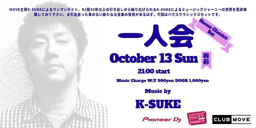 MOVE主賓K-SUKEによるワンマンナイト。DJ歴30年以上の引き出しから繰り広げられるK-SUKEによるミュージックジャーニーの世界を是非体験してみて下さい。まだ出会った事のない新たなる音楽の発見があるはず。今回はハウスクラシックスセットです。