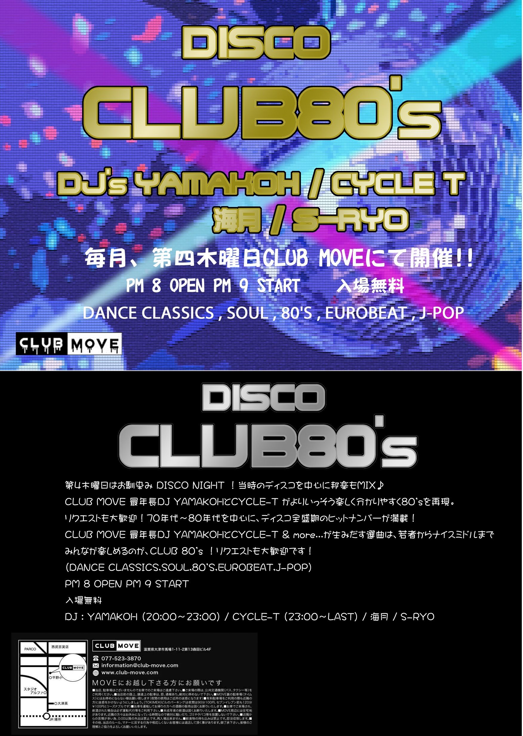 第4木曜日はお馴染み DISCO NIGHT !当時のディスコを中心に邦楽もMIX♪CLUB MOVE 最年長DJ YAMAKOHとCYCLE-T がよりいっそう楽しく分かりやすく80'sを再現。