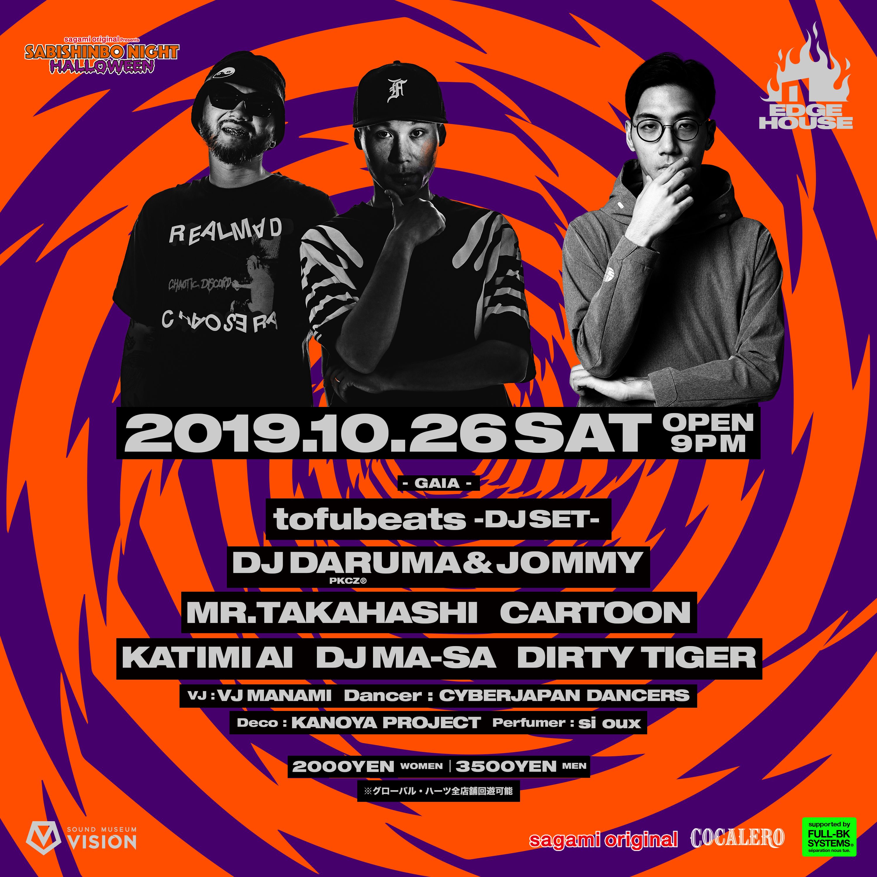 SMAP、平井堅、Crystal Kayのリミックス、ゆずのサウンドプロデュース、CM音楽制作、コラム連載等、多彩な才能を発揮するtofubeatsをメインフロアのゲストに迎える。DJ KEKKE、CHARIらが名を連ねるDEEP SPACEはHIP-HOP、Bass Music中心のフロアに。他にもMAGARA、DJ SOULJAH、DJ OCHAZUKEなどハロウィンらしい豪華ラインナップでお送りする。