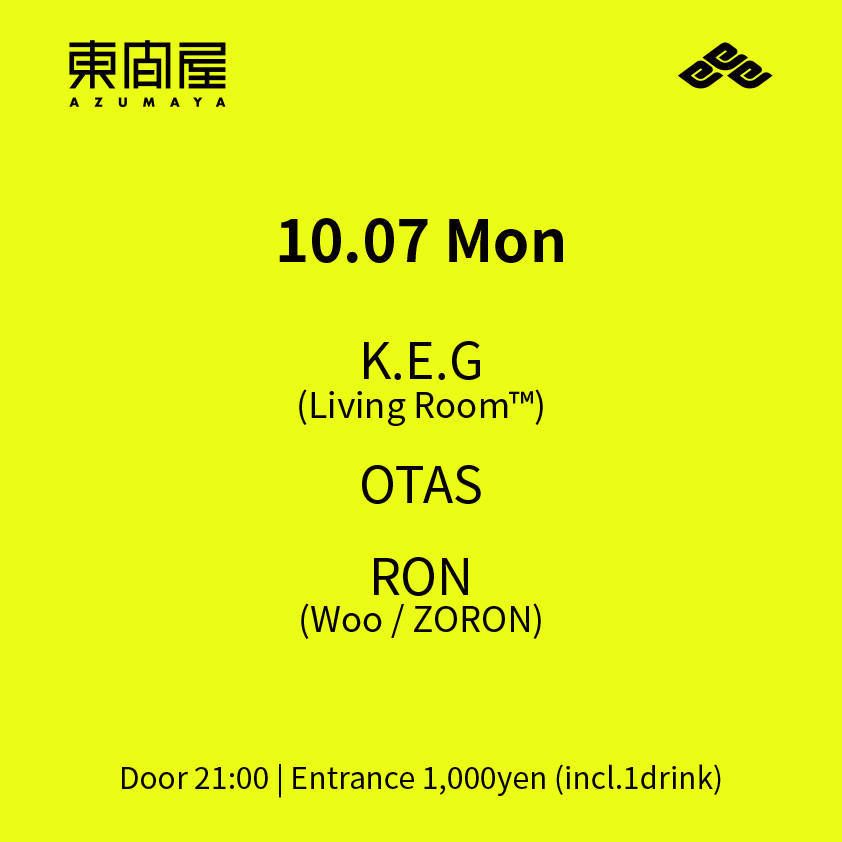 2019.10 07 OCT Azumaya -Monday- HOUSE 0 Shares Facebook Twitter google Line DATE: 2019-10-07 MON OPEN: 21:00 VENUE: PRICE: Entrance 1,000yen(incl. 1drink) LINE UP: K.E.G(Living Room™) OTAS RON(Woo / ZORON)