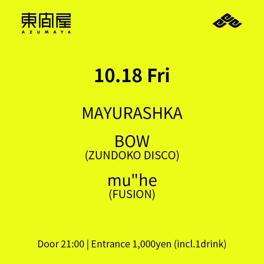 2019.10 18 OCT Azumaya -Friday- HOUSE TECHNO 0 Shares Facebook Twitter google Line DATE: 2019-10-18 FRI OPEN: 21:00 VENUE: PRICE: Entrance 1,000yen(incl. 1drink) LINE UP: MAYURASHKA BOW(ZUNDOKO DISCO) mu"he(FUSION)