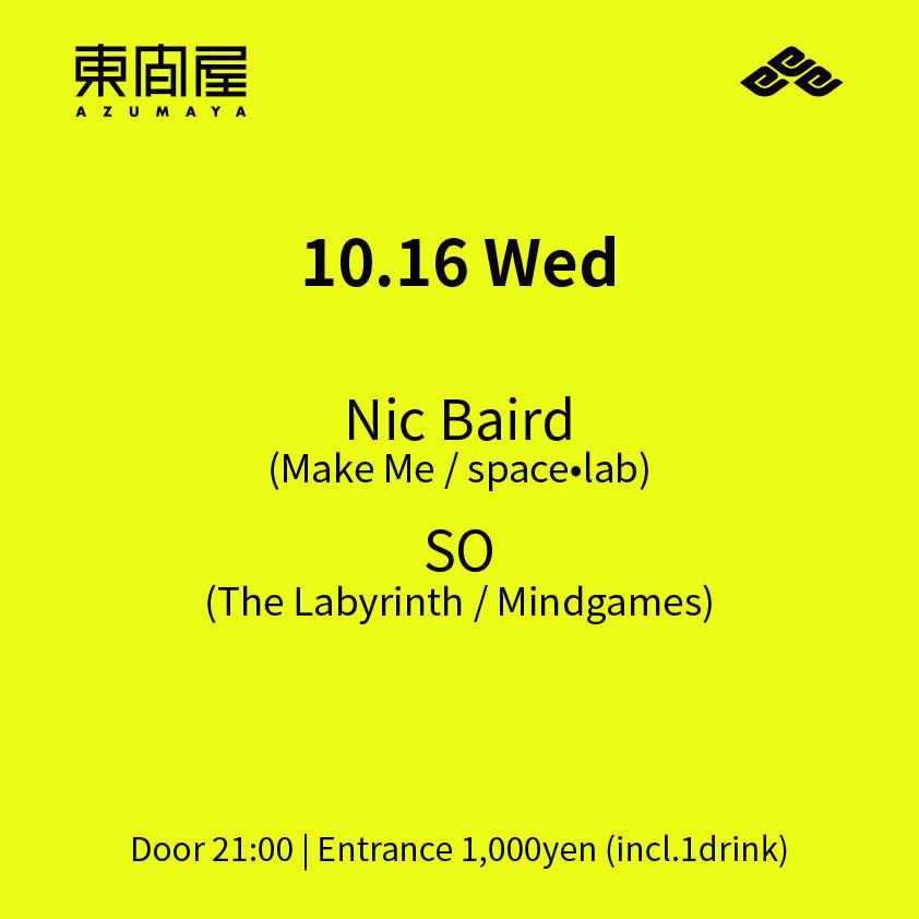 2019.10 16 OCT Azumaya -Wednesday- TECHNO 0 Shares Facebook Twitter google Line DATE: 2019-10-16 WED OPEN: 21:00 VENUE: PRICE: Entrance 1,000yen(incl. 1drink) LINE UP: Nic Baird(Make Me / space•lab) SO(The Labyrinth / Mindgames)