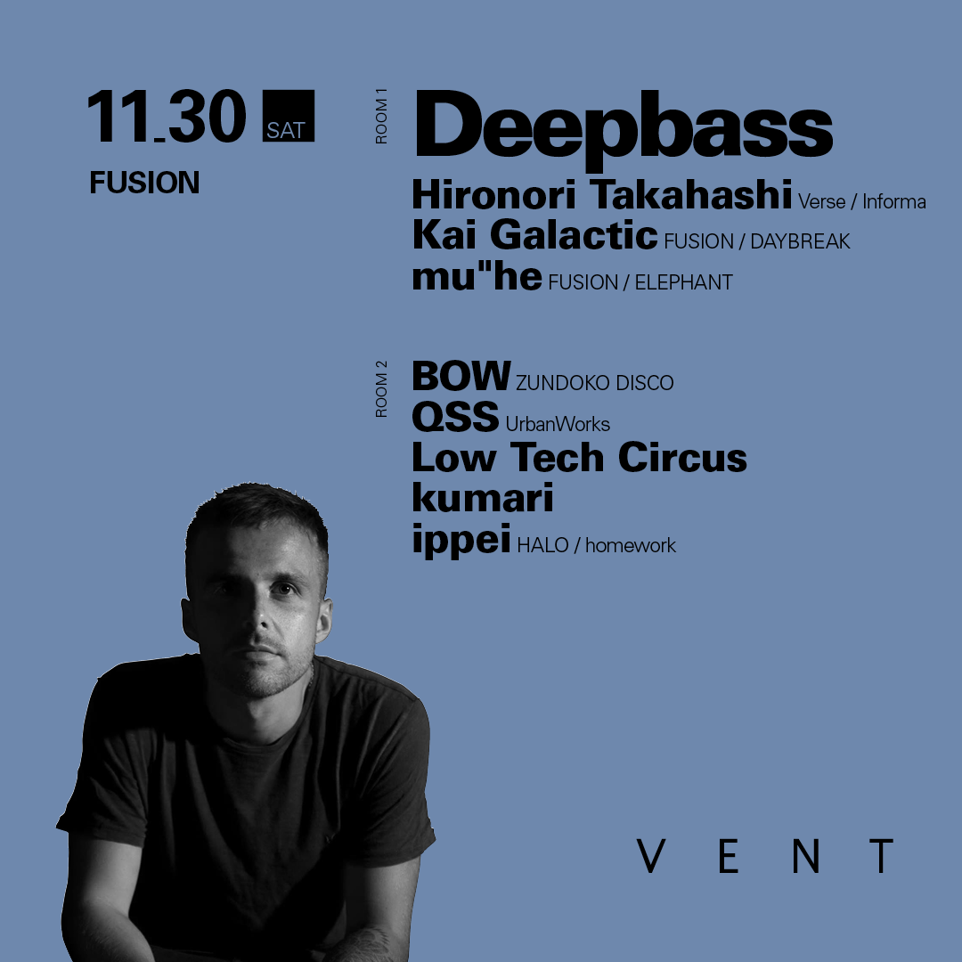 ホストを務めるのは、mu”heとKai Galacticが仕掛ける新パーティFUSION。第一回目となった前回はTresorのレジデントでありRadio MatrixのボスDelta Funktionenと国内ヘッドライナーとしてGonnoをブッキングし、都内のテクノヘッズが集まる熱狂の夜となり成功を収めた。今回はROOM1にDeepbassのレーベル、InformaからもリリースするHironori Takahashiの出演も決定した。進化を続けるニュースクール・テクノの最前線を直に体験できるイベントになるだろう!