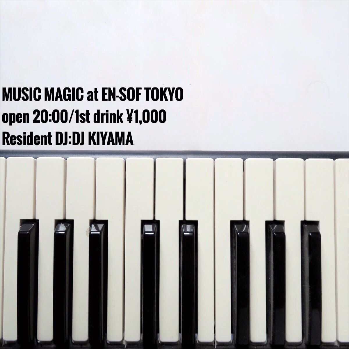 渋谷EN-SOF TOKYOにて毎週木曜日開催されている『MUSIC MAGIC』。ハウスを軸にダブ、ルーツ、ラバーズ、アフロ、ファンク、ソウル、ラテン、ブラジル、ジャズファンク、ロック、ニューウェーブ、80's等の新譜を中心に珠玉のレコードを厳選しプレイしている。ResidentのDJ KIYAMAは78年よりDJを開始し現在も都内のクラブ/バーを中心に精力的な活動を行なっている。これまでにJ WAVEやFM TOKYOのラジオ番組制作をはじめ、伝説のAIR FM、渋谷FMの開局に携わり、宇多田ヒカルのリミックスや楽曲のリリース等ダンスミュージックの発展に大きく貢献してきた。DJの中でも楽曲の知識は群を抜きハードディガーとしても知られるがショッピングモール等の商業施設、企業のレセプションパーティー、有線のアダルトコンテンポラリーまでコンセプトに合わせた選曲をこなす。レコードの扱いは非常に繊細でアーティストや楽曲に対する深い愛情とリスペクトを感じずにはいられない。