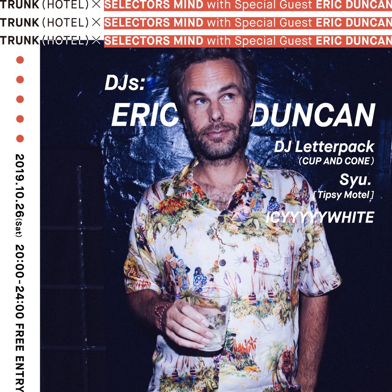 2019.10 26 OCT TRUNK (HOTEL) × SELECTORS MIND with Special Guest ERIC DUNCAN HOUSE DISCO HIPHOP R&B 0 Shares Facebook Twitter google Line DATE: 2019-10-26 SAT OPEN: 20:00 VENUE: PRICE: FREE ENTRY LINE UP: DJs: Eric Duncan DJ Letterpack [CUP AND CONE] Syu. [Tipsy Motel] ICYYYYYWHITE TRUNK (HOTEL)にNYCのアンダーグラウンドディスコ~ハウスシーンにおける最重要人物「ERIC DUNCAN」が登場。 ローカルDJはINTERVIEW / MIXES / PARTY / TICKETSの4つの軸で活動するDJ特化型プロジェクト 「SELECTORS MIND」がセレクト。 COZYな空間をプロデュースするオンラインストア「COZYHOUSETOKYO」とアートコレクティブチーム「Tipsy Motel」が一日限りのPOP UP SHOPをオープン。