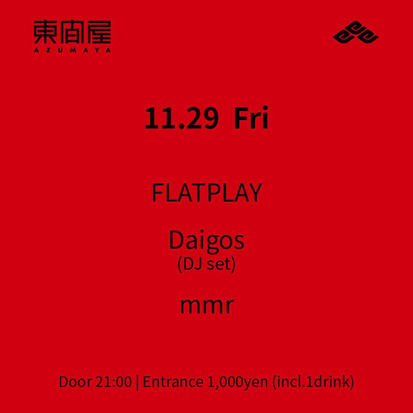 2019.11 29 NOV Azumaya -Friday- TECHNO 0 Shares Facebook Twitter google Line DATE: 2019-11-29 FRI OPEN: 21:00 VENUE: PRICE: Entrance 1,000yen(incl. 1drink) LINE UP: FLATPLAY Daigos(DJ set) mmr