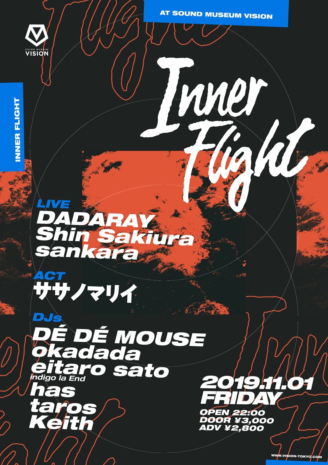 ROCK~POPS~TECHNO~HOUSE~ELECTRONICA~HIPHOP~BASS~といった様々な音楽の形態を一夜に詰め込み、4フロアで展開していくパーティー「slow dance」がグレードアップし「Inner Flight」となりリニューアルスタート!