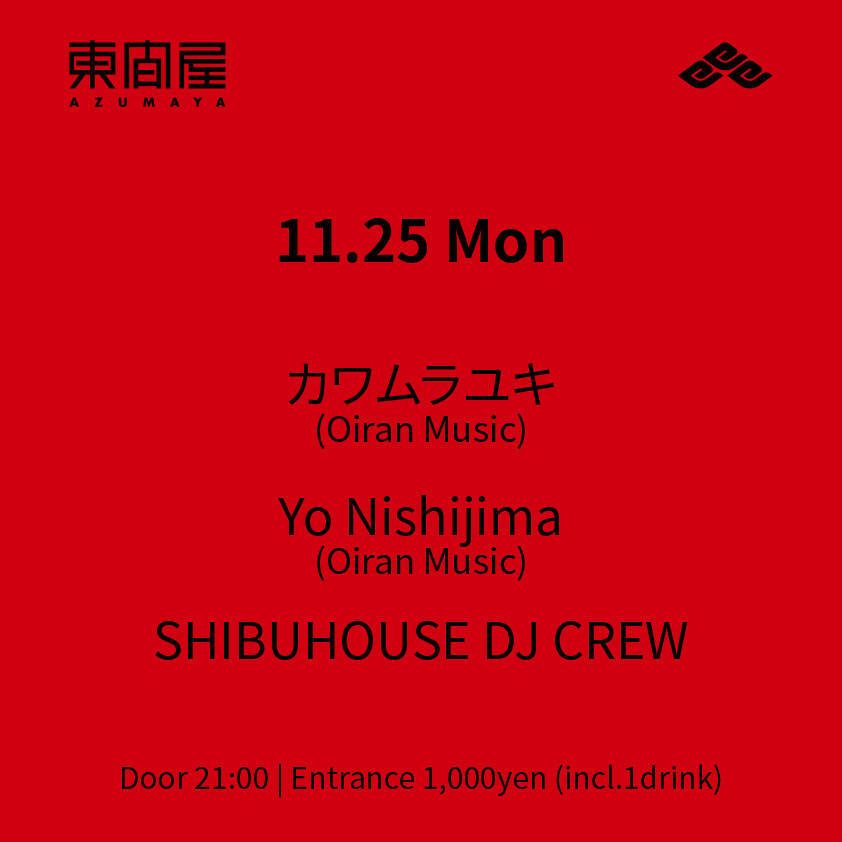 2019.11 25 NOV Azumaya -Monday- HOUSE TECHNO 0 Shares Facebook Twitter google Line DATE: 2019-11-25 MON OPEN: 21:00 VENUE: PRICE: Entrance 1,000yen(incl. 1drink) LINE UP: カワムラユキ(Oiran Music) Yo Nishijima(Oiran Music) SHIBUHOUSE DJ CREW