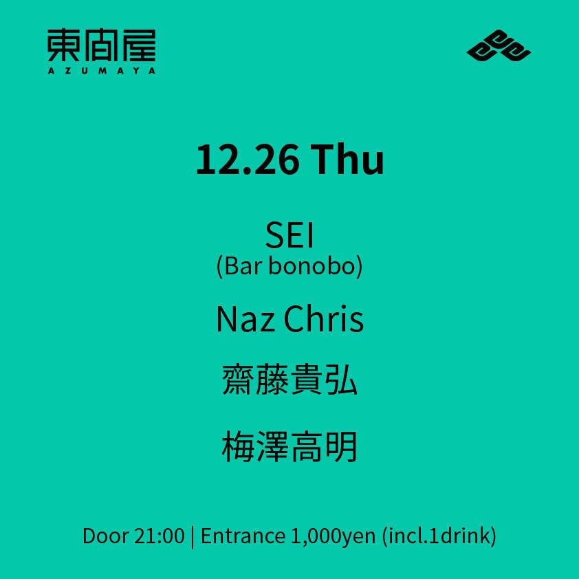 2019.12 26 DEC Azumaya -Thursday- HOUSE 0 Shares Facebook Twitter google Line DATE: 2019-12-26 THU OPEN: 21:00 VENUE: PRICE: Entrance 1,000yen(incl. 1drink) LINE UP: SEI(Bar bonobo) Naz Chris 齋藤貴弘 梅澤高明