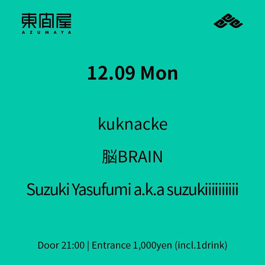 2019.12 09 DEC Azumaya -Monday- TECHNO HOUSE 0 Shares Facebook Twitter google Line DATE: 2019-12-09 MON OPEN: 21:00 VENUE: PRICE: Entrance 1,000yen(incl. 1drink) LINE UP: kuknacke 脳BRAIN Suzuki Yasufumi a.k.a suzukiiiiiiiiii