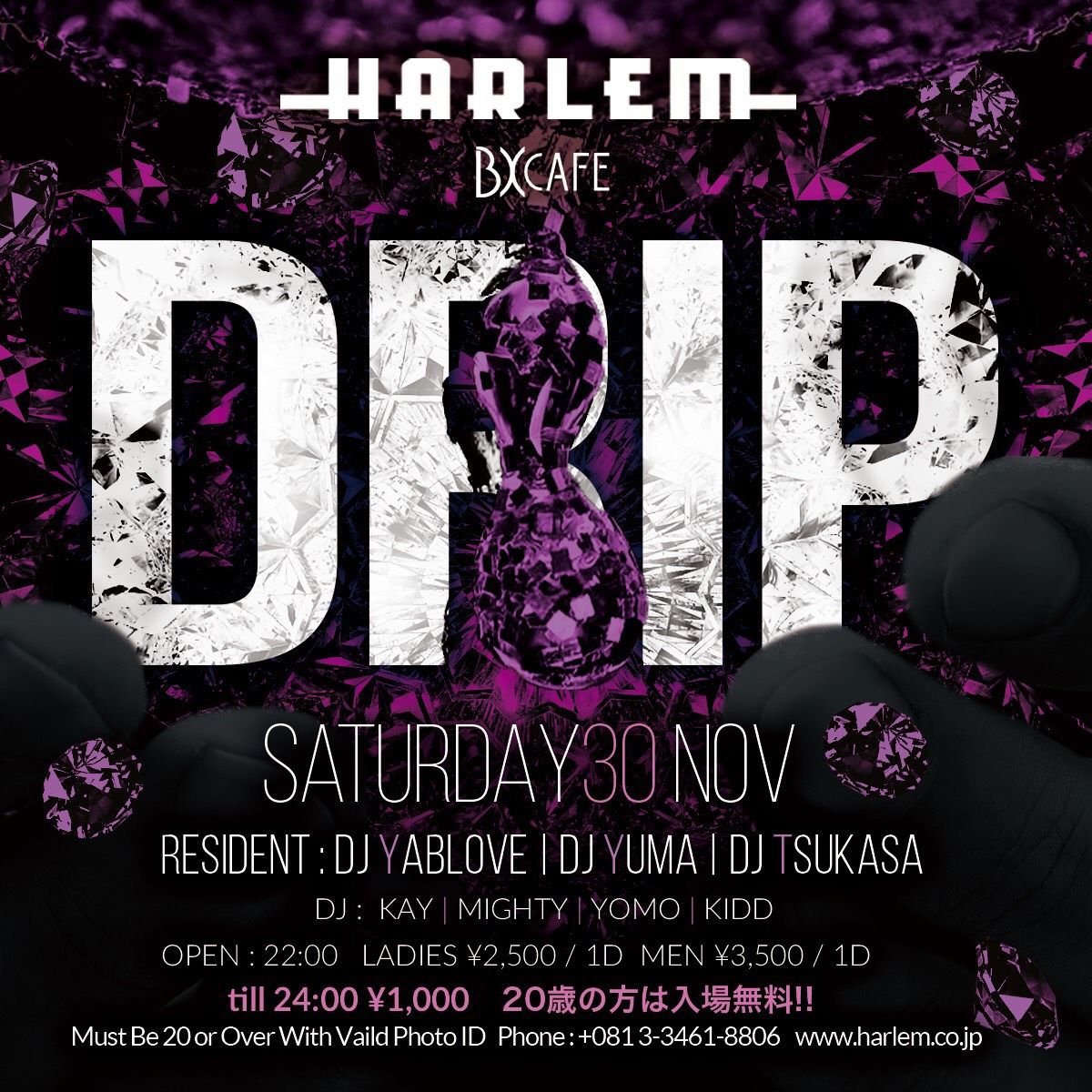 - LADIES ¥2,500/1d MEN ¥3,500/1d *till 24:00 ¥1,000 ※ 20歳の方は入場無料!