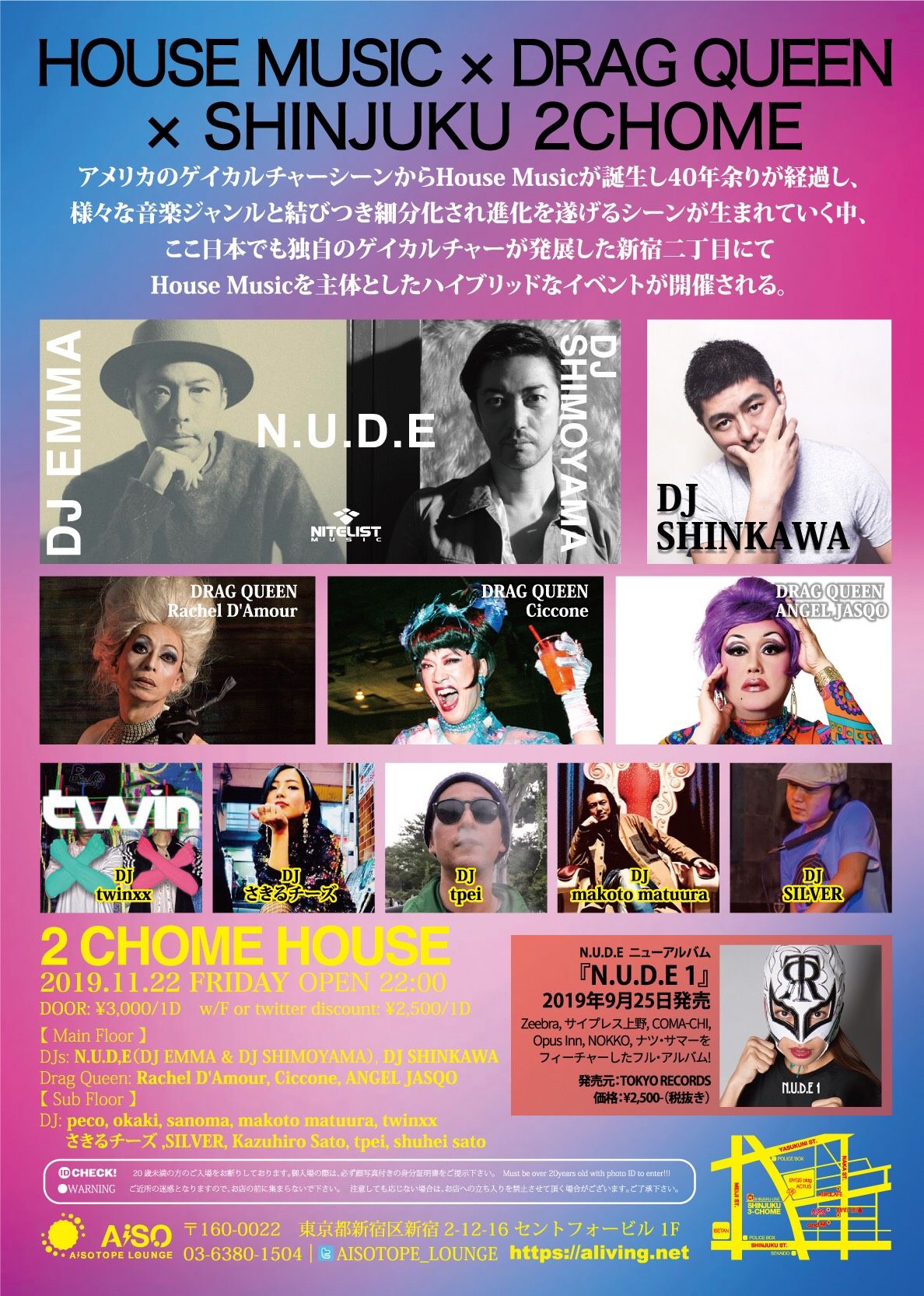 アメリカのゲイカルチャーシーンからHouse Musicが誕生し40年余りが経過し、様々な音楽ジャンルと結びつき細分化され進化を遂げるシーンが生まれていく中、ここ日本でも独自のゲイカルチャーが発展した新宿二丁目にてHouse Musicを主体としたハイブリッドなイベントが開催される。