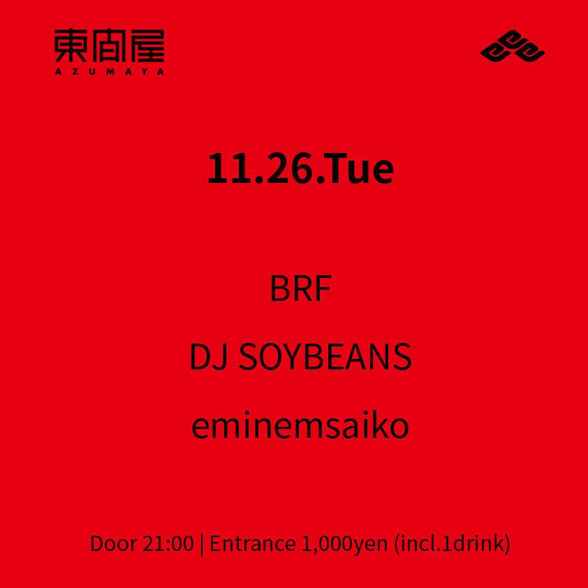 2019.11 26 NOV Azumaya -Tuesday- HOUSE TECHNO 0 Shares Facebook Twitter google Line DATE: 2019-11-26 TUE OPEN: 21:00 VENUE: PRICE: Entrance 1,000yen(incl. 1drink) LINE UP: BRF DJ SOYBEANS eminemsaiko