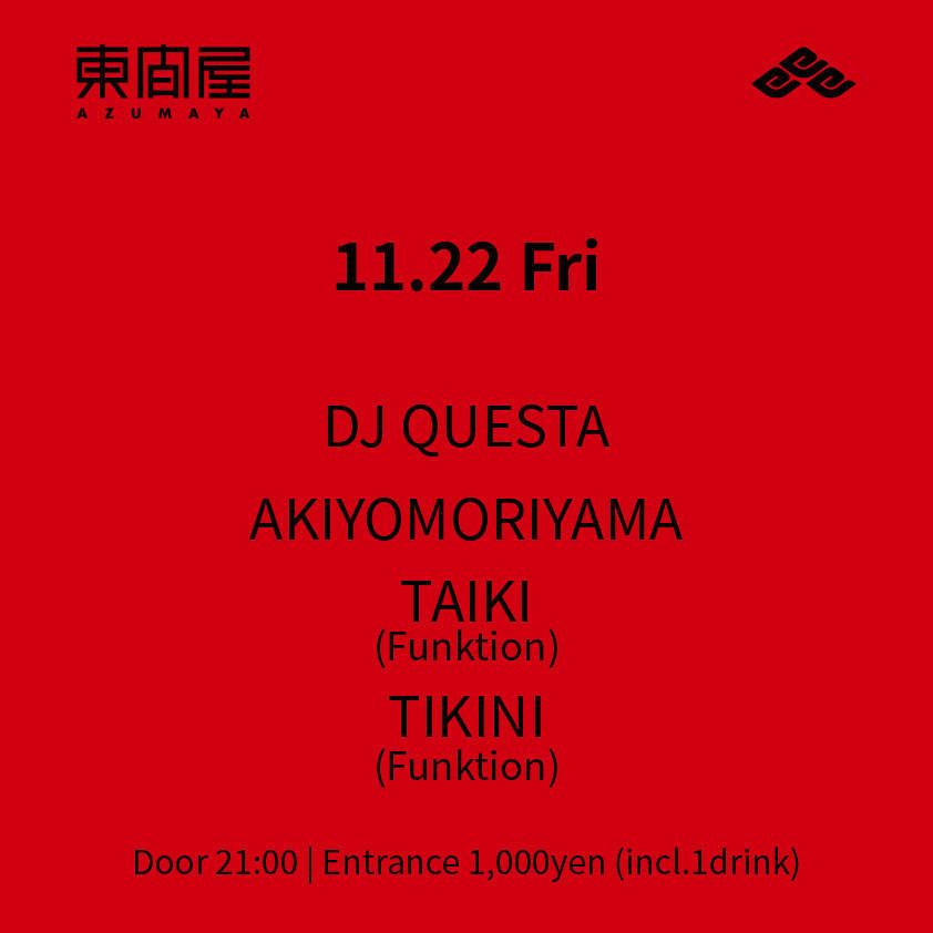 2019.11 22 NOV Azumaya -Friday- HOUSE 0 Shares Facebook Twitter google Line DATE: 2019-11-22 FRI OPEN: 21:00 VENUE: PRICE: Entrance 1,000yen(incl. 1drink) LINE UP: DJ QUESTA AKIYOMORIYAMA TAIKI(Funktion) TIKINI(Funktion)