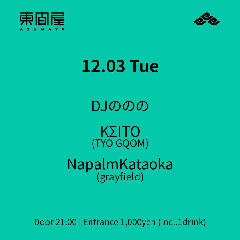 2019.12 03 DEC Azumaya -Tuesday- TECHNO 0 Shares Facebook Twitter google Line DATE: 2019-12-03 TUE OPEN: 21:00 VENUE: PRICE: Entrance 1,000yen(incl. 1drink) LINE UP: DJののの KΣITO(TYO GQOM) NapalmKataoka(grayfield)