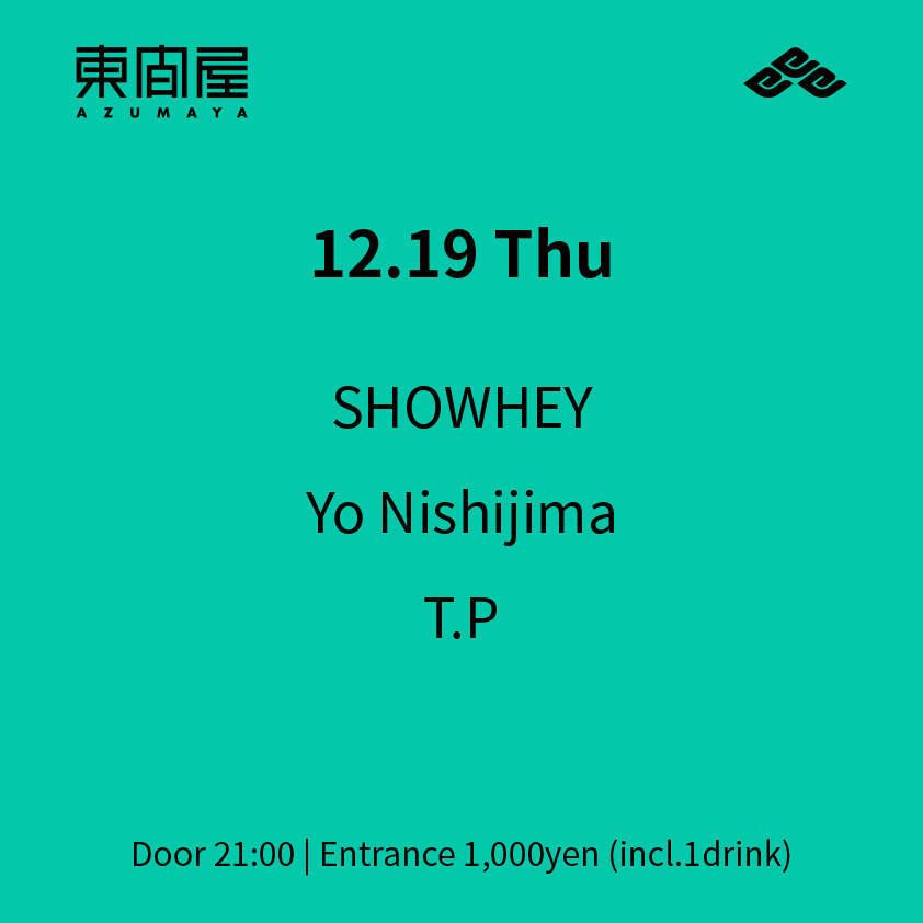 2019.12 19 DEC Azumaya -Thursday- HOUSE 0 Shares Facebook Twitter google Line DATE: 2019-12-19 THU OPEN: 21:00 VENUE: PRICE: Entrance 1,000yen(incl. 1drink) LINE UP: SHOWHEY Yo Nishijima T.P