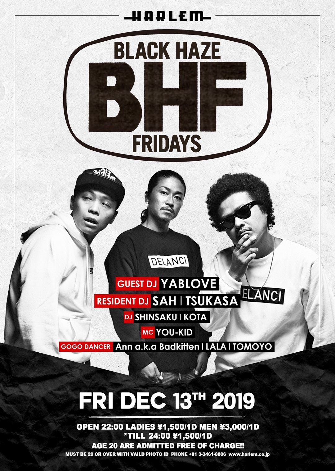 - LADIES ¥1,500/1d MEN ¥3,000/1d *till 24:00 ¥1,500/1d ※ 20歳の方は入場無料!