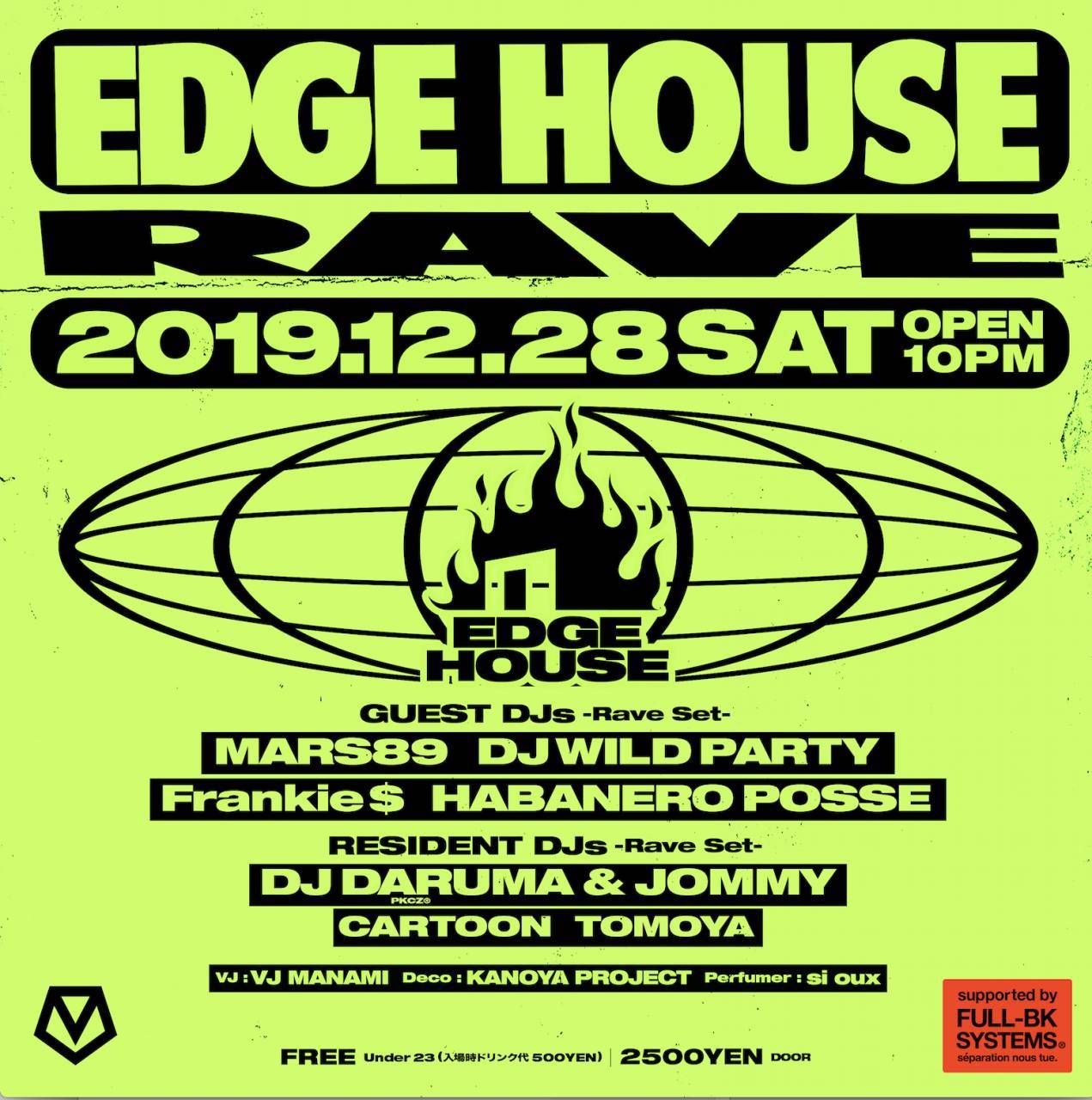 MARS89、DJ WILDPARTY、Frankie$、HABANERO POSSE…今回のゲスト陣によるRAVE SETも必聴です。23歳未満はエントランスフリー!年末の踊り納めには「EDGE HOUSE RAVE」をオススメします!