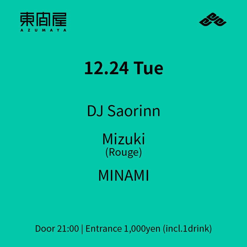 2019.12 24 DEC Azumaya -Tuesday- HOUSE TECHNO 0 Shares Facebook Twitter google Line DATE: 2019-12-24 TUE OPEN: 21:00 VENUE: PRICE: Entrance 1,000yen(incl. 1drink) LINE UP: DJ Saorinn Mizuki(Rouge) MINAMI