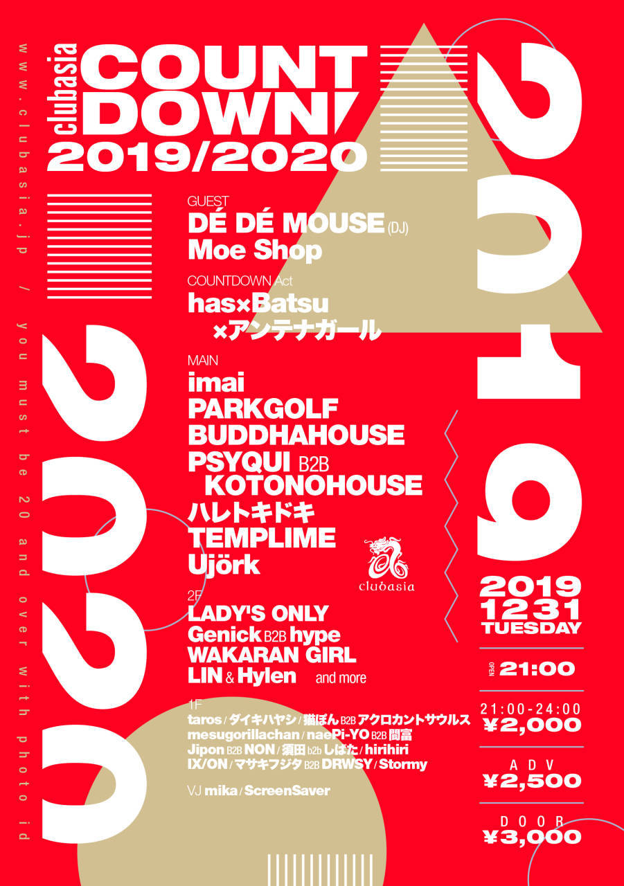 GUESTには国内外問わず幅広い活動域で先日ニューアルバム『Nulife』をリリースしたばかりのDÉ DÉ MOUSE , ジャパニーズ・オタク・カルチャーとフレンチ・エレクトロを見事に融合させネット世代の音楽リスナーに新たなFuture Funkの旋風を巻き起こすネットレーベル、MOE SHOP RECORDINGS主宰Moe Shopが登場。COUNTDOWN Actにはclubasiaではお馴染みのDJ has そして関西を拠点に活躍するBatsuによるSpecial B2Bに、先日活動休止がアナウンスされたアンテナガールが令和元年をしめる!2019年に始動したNEW PARTY『FFF』『FUTURE WHAT'S』『Mock You』を中心にclubasiaを大いに盛り上げたアーティストが大集結!大晦日はclubasiaで盛大に2020年を迎えよう!