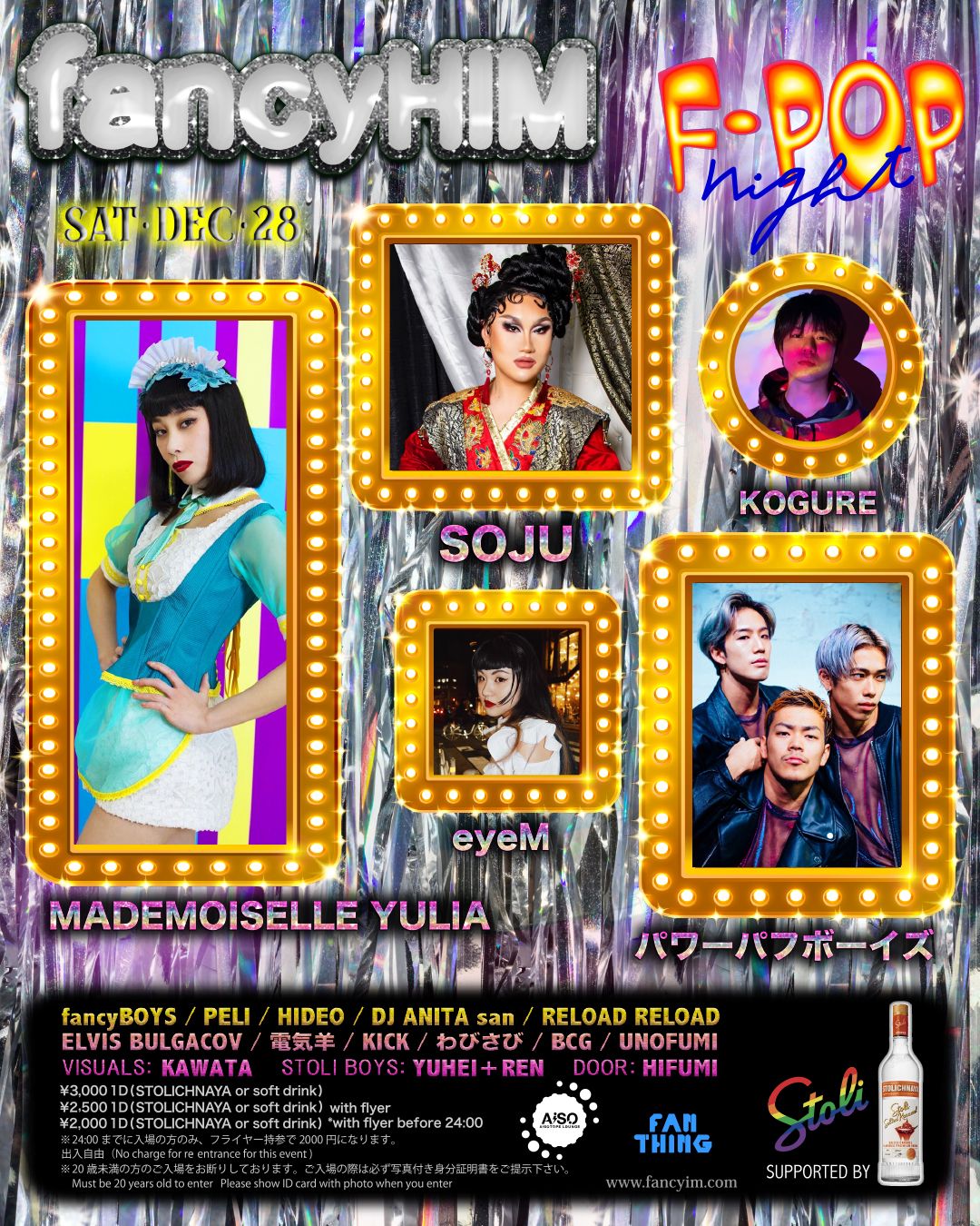 今年最後のファンシーヒム はスペシャルゲストに、最新の「ル・ポールのドラッグレース」シーズン11、に出演を果たした、SOJUがファンシーヒムに再来襲 !ブレークアウトしたソジュのショーをお見逃しなく!また、マドモアゼル・ユリアがファンシーヒム に1年ぶりに帰って来る他、話題のダンスユニット、パワーパフボーイズが初出演!ソジュのオリジナルソングで、コラボも実現する!そしてDJにeyeM、KOGUREが初出演。キラキラファンシーなポップナイト!