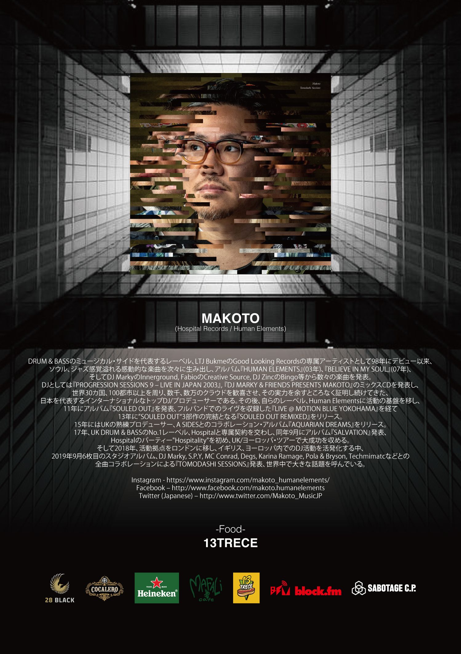 ソウル、ジャズ感覚溢れる感動的な楽曲を次々に発表し、世界30カ国100都市以上を周り数千数万のクラウドを歓喜させその実力を余すところなく証明し続けてきた、日本が世界に誇るTOP ドラムンベースDJ/プロデューサーMAKOTOが満を侍して来沖。