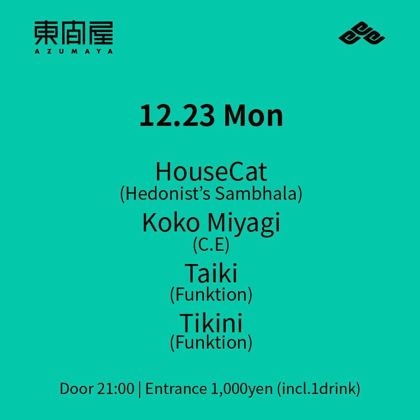 2019.12 23 DEC Azumaya -Monday- HOUSE HIPHOP 0 Shares Facebook Twitter google Line DATE: 2019-12-23 MON OPEN: 21:00 VENUE: PRICE: Entrance 1,000yen(incl. 1drink) LINE UP: HouseCat(Hedonist’s Sambhala) Koko Miyagi(C.E) Taiki(Funktion) Tikini(Funktion)