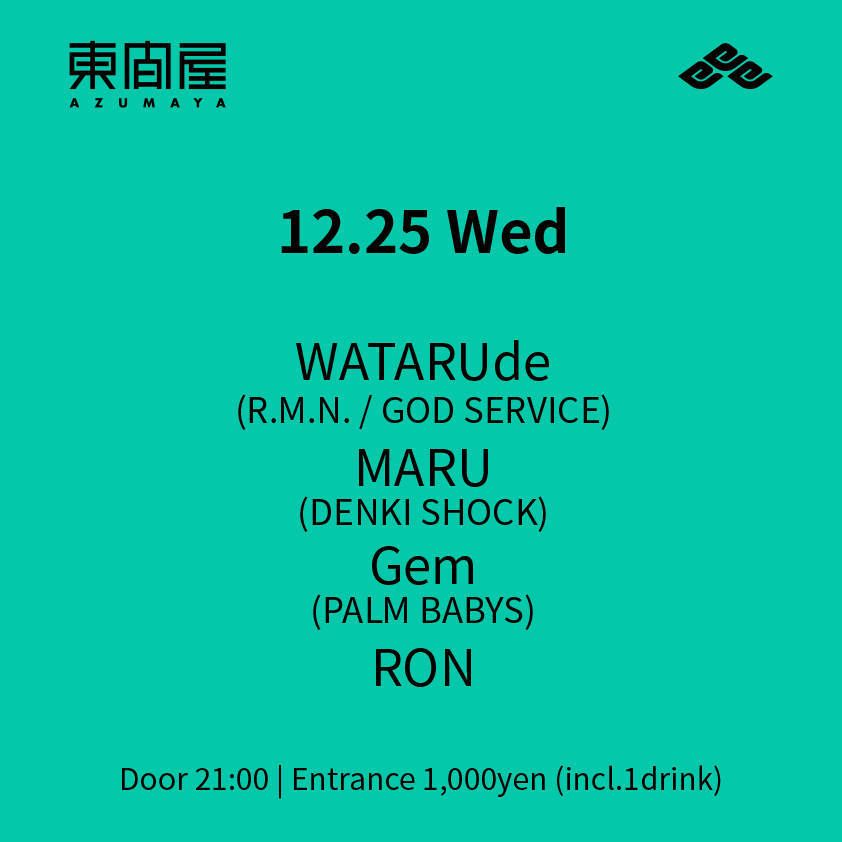 2019.12 25 DEC Azumaya -Wednesday- HOUSE DISCO 0 Shares Facebook Twitter google Line DATE: 2019-12-25 WED OPEN: 21:00 VENUE: PRICE: Entrance 1,000yen(incl. 1drink) LINE UP: WATARUde(R.M.N. / GOD SERVICE) MARU(DENKI SHOCK) Gem(PALM BABYS) RON