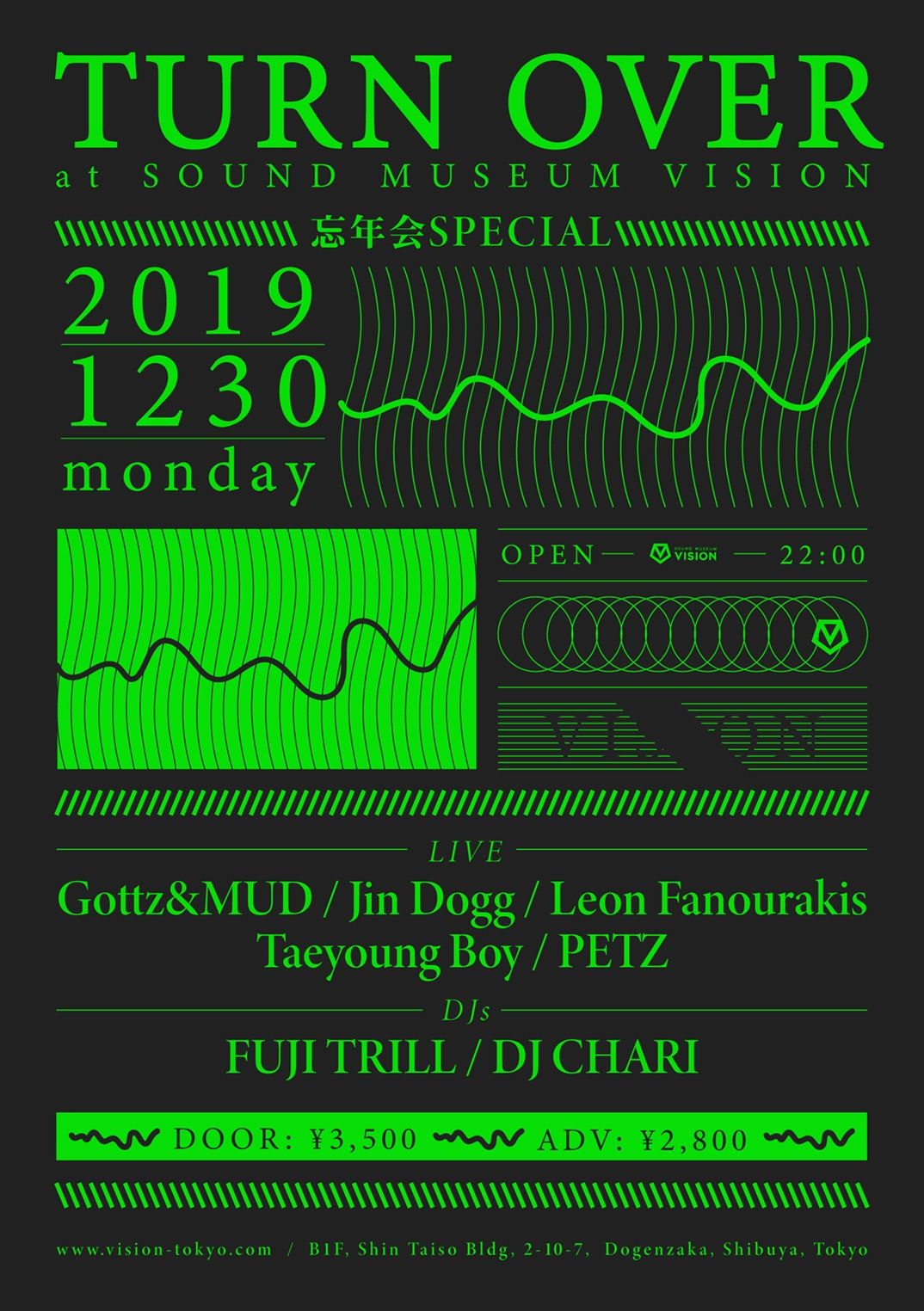 VISIONのレギュラーHIPHOP PARTYとして大好評の「Turn Over」。今回は、ライブアクトに人気ヒップホップクルーKANDYTOWNからGottz&MUD、先日2枚のアルバム「SAD JAKE」「MAD JAKE」を同時リリースし話題を呼んでいるJin Dogg、「高校生ラップ選手権」「ラップスタア誕生!」両大会で優勝を飾り、その後も勢力的なライブ活動を行っているLeon Fanourakis、国外問わず活動が目まぐるしい要注目のラッパーTaeyoung Boyなどライブハウスやクラブを湧かせる錚々たる顔ぶれが揃った。