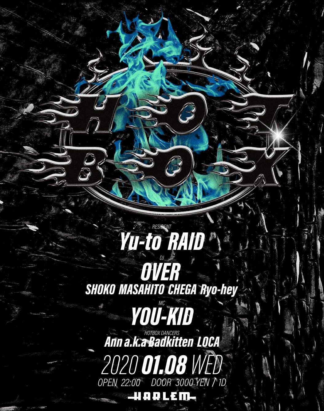 2020.01 08 JAN HOTBOX HIPHOP ALLMIX 0 Shares Facebook Twitter google Line DATE: 2020-01-08 WED OPEN: 22:00 VENUE: PRICE: ¥3,000/1d LINE UP: RESIDENT DJ: Yu-to, RAID DJ: OVER, SHOKO, MASAHITO, CHEGA, Ryo-hey MC: YOU-KID RESIDENT DJ: Yu-to, RAID DJ: OVER, SHOKO, MASAHITO, CHEGA, Ryo-hey MC: YOU-KID