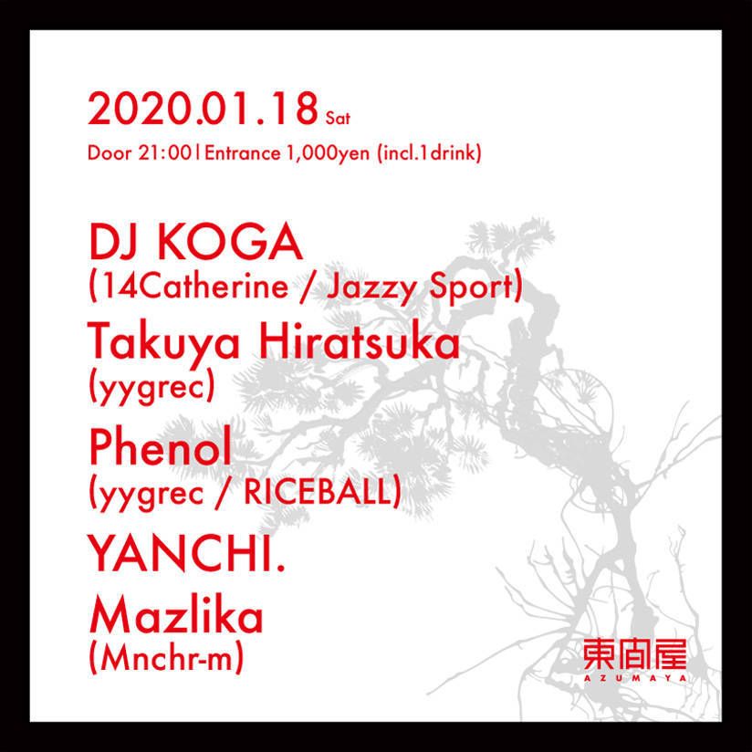 2020.01 18 JAN Azumaya -Saturday HOUSE TECHNO 0 Shares Facebook Twitter google Line DATE: 2020-01-18 SAT OPEN: 21:00 VENUE: PRICE: Entrance 1,000yen(incl. 1drink) LINE UP: DJ KOGA(14Catherine / Jazzy Sport) Takuya Hiratsuka(yygrec) Phenol(yygrec / RICEBALL) YANCHI. Mazlika(Mnchr-m)