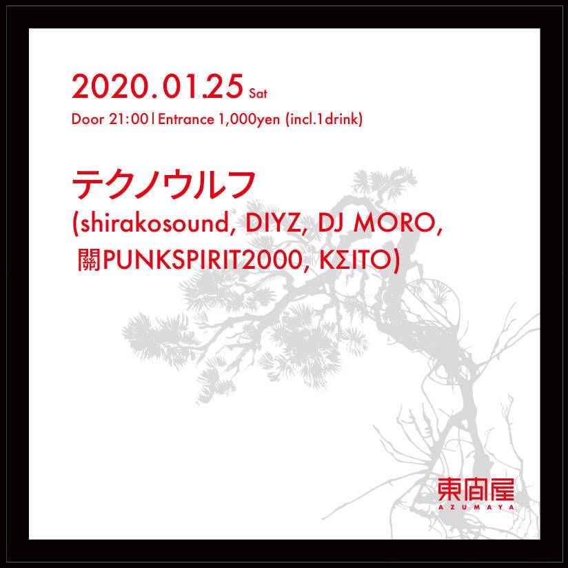 2020.01 25 JAN Azumaya -Saturday TECHNO 0 Shares Facebook Twitter google Line DATE: 2020-01-25 SAT OPEN: 21:00 VENUE: PRICE: Entrance 1,000yen(incl. 1drink) LINE UP: テクノウルフ [shirakosound, DIYZ, DJ MORO , 關PUNKSPIRIT2000, KΣITO]