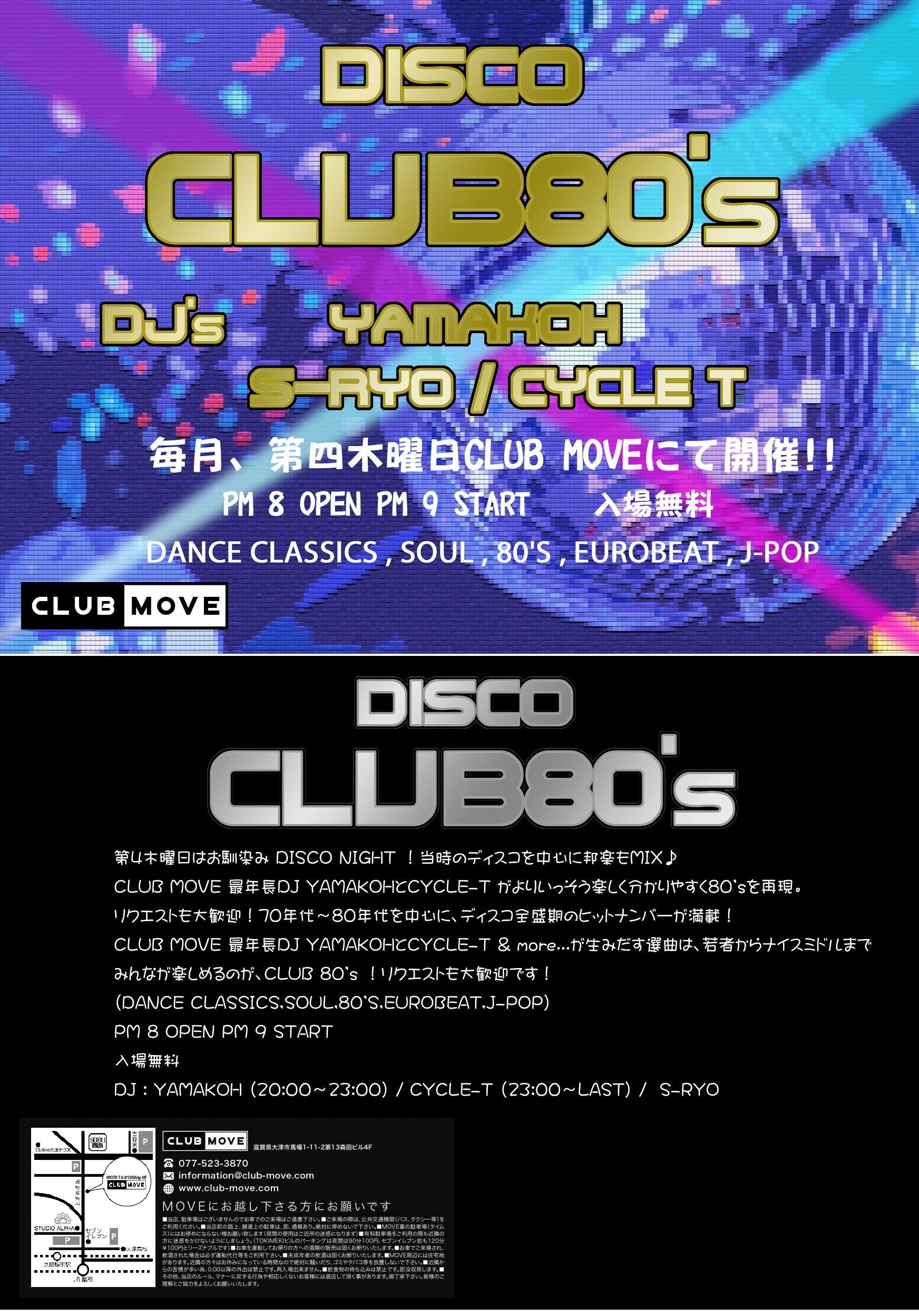 第4木曜日はお馴染み DISCO NIGHT !当時のディスコを中心に邦楽もMIX♪CLUB MOVE 最年長DJ YAMAKOHとCYCLE-T がよりいっそう楽しく分かりやすく80'sを再現。