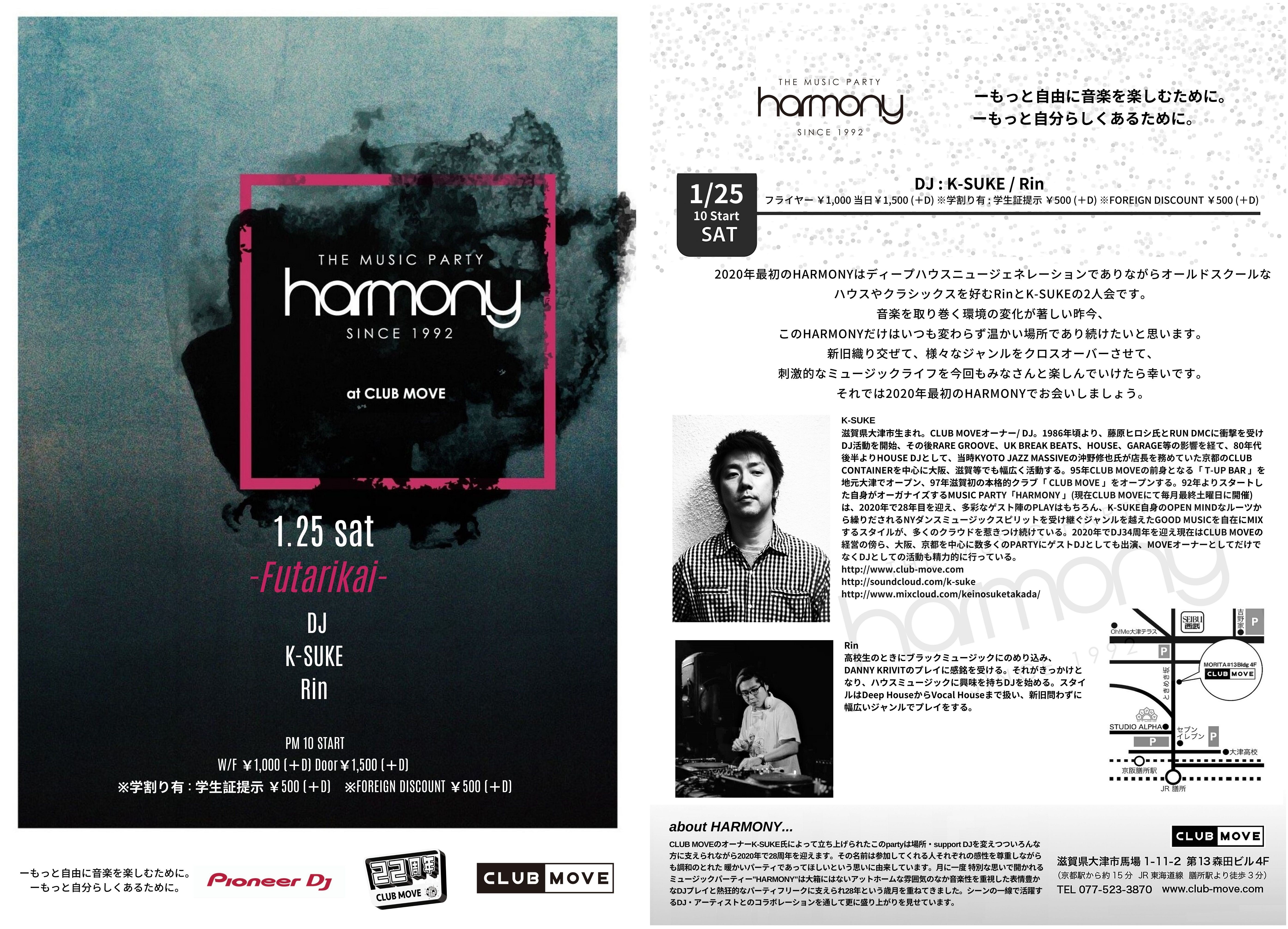2020年最初のHARMONYはディープハウスニュージェネレーションでありながらオールドスクールなハウスやクラシックスを好むRinとK-SUKEの2人会です。