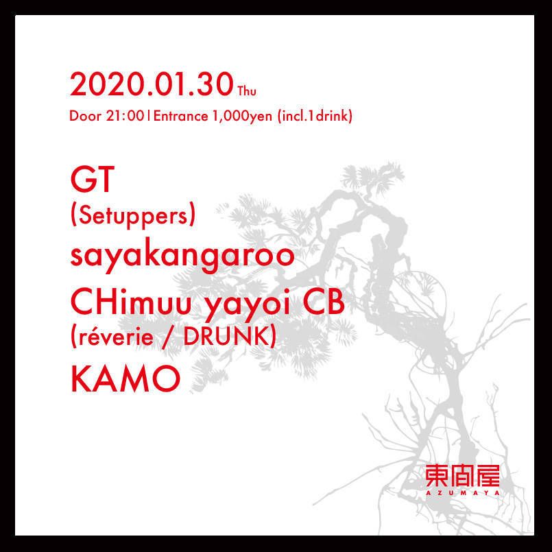2020.01 30 JAN Azumaya -Thursday- HOUSE TECHNO 0 Shares Facebook Twitter google Line DATE: 2020-01-30 THU OPEN: 21:00 VENUE: PRICE: Entrance 1,000yen(incl. 1drink) LINE UP: GT(Setuppers) sayakangaroo CHimuu yayoi CB(réverie/DRUNK) KAMO