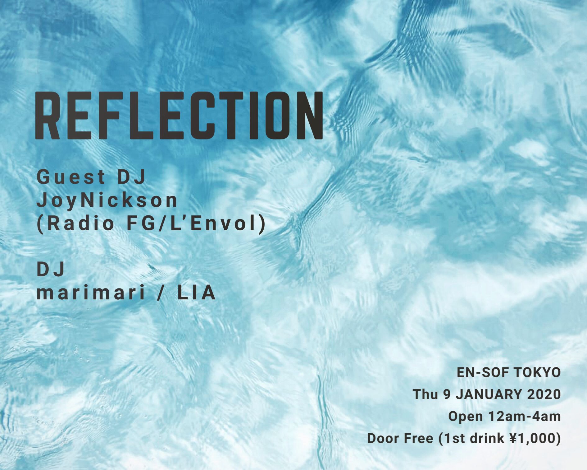 2020.01 09 JAN REFLECTION HOUSE DEEP HOUSE TECHNO DISCO DRUM&BASS 0 Shares Facebook Twitter google Line DATE: 2020-01-09 THU OPEN: 23:50 VENUE: PRICE: Door Free (1st drink ¥1,000) LINE UP: ▼Guest DJ JoyNickson (Radio FG/L’Envol) ▼DJ marimari (UNITED TECHNO FAMILLIA) LIA (UTX) Thursday Midnight Party!!! フランスよりDJ JoyNicksonを迎えての開催!!! https://soundcloud.com/joynickson