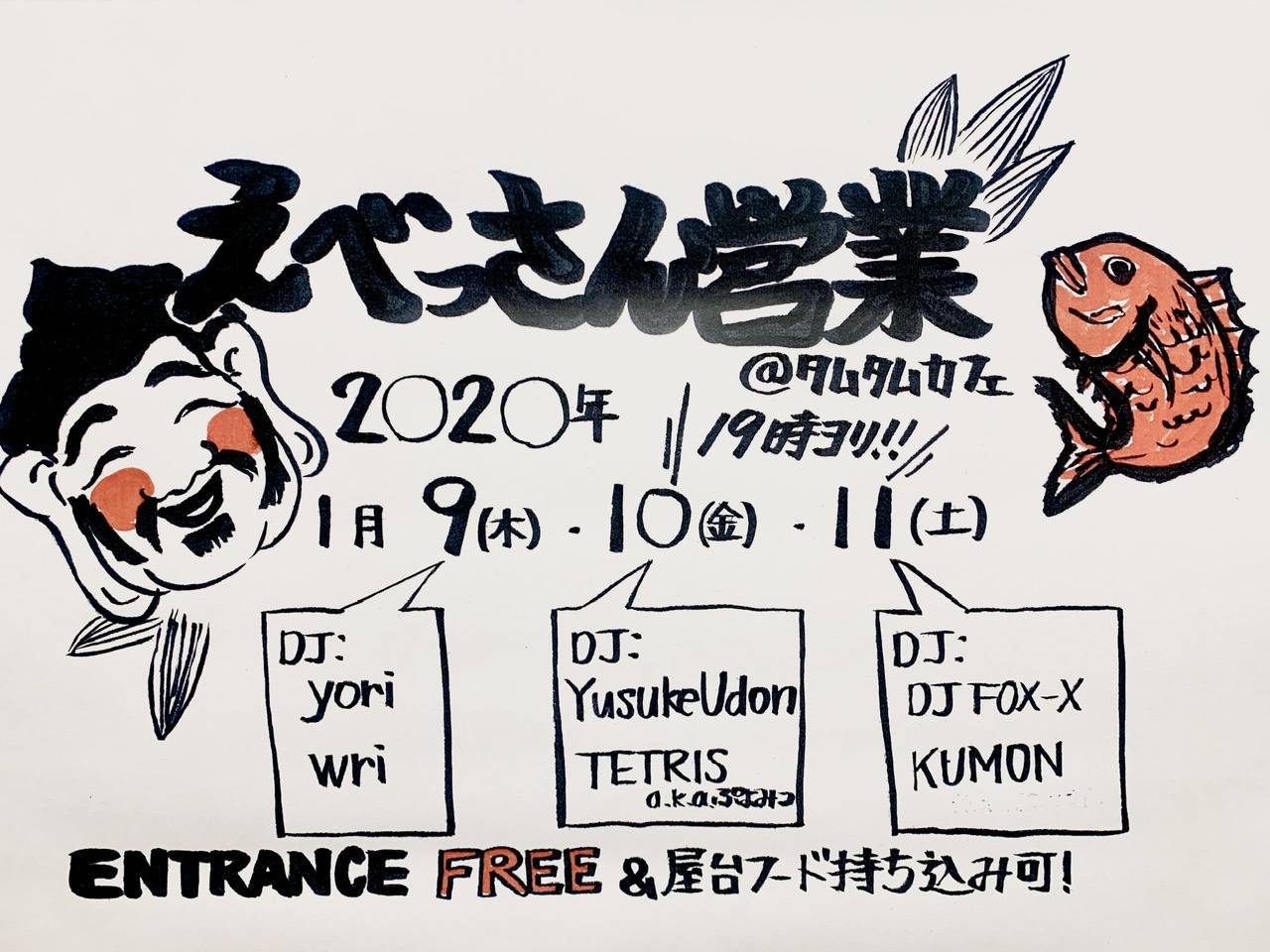1月9日木曜〜11日土曜は19時〜24時フードラストオーダーで今宮戎神社の十日戎に伴い『えべっさん営業』。十日戎期間中は屋台のフード持ち込み可能!人混みと寒さに疲れたアナタの休憩場所にも是非◎今年はDJもお願いして新年会的な感じでやってます♫