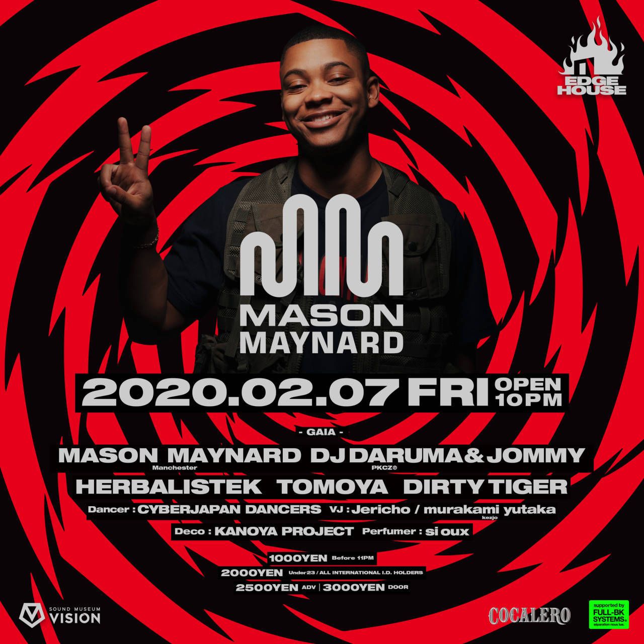 - 1000YEN - Before 23:00, 2000YEN - Under23, 2000YEN - ALL INTERNATIONAL I.D. HOLDERS, 2500YEN - ADV TICKET, 2500YEN - FB DISCOUNT, 3000YEN – DOOR