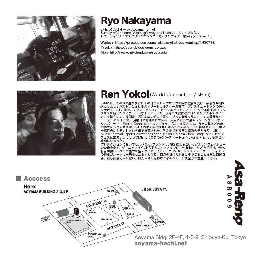 2019.01 19 JAN Asa-Reng ASR009 HOUSE TECHNO 0 Shares Facebook Twitter google Line DATE: 2019-01-19 SAT OPEN: 06:00 VENUE: PRICE: DOOR: ¥1000 LINE UP: DJ Ryo Nakayama Ren Yokoi (World Connection / sHim)