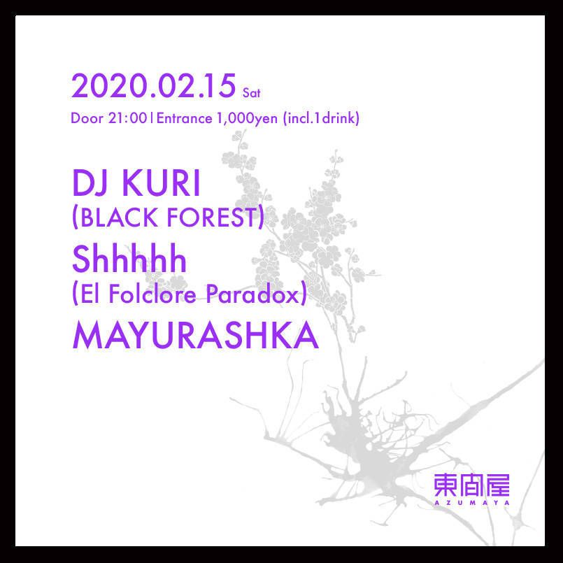 2020.02 15 FEB Azumaya -Saturday TECHNO HOUSE 0 Shares Facebook Twitter google Line DATE: 2020-02-15 SAT OPEN: 21:00 VENUE: PRICE: Entrance 1,000yen(incl. 1drink) LINE UP: DJ KURI (BLACK FOREST) Shhhhh (El Folclore Paradox) MAYURASHKA